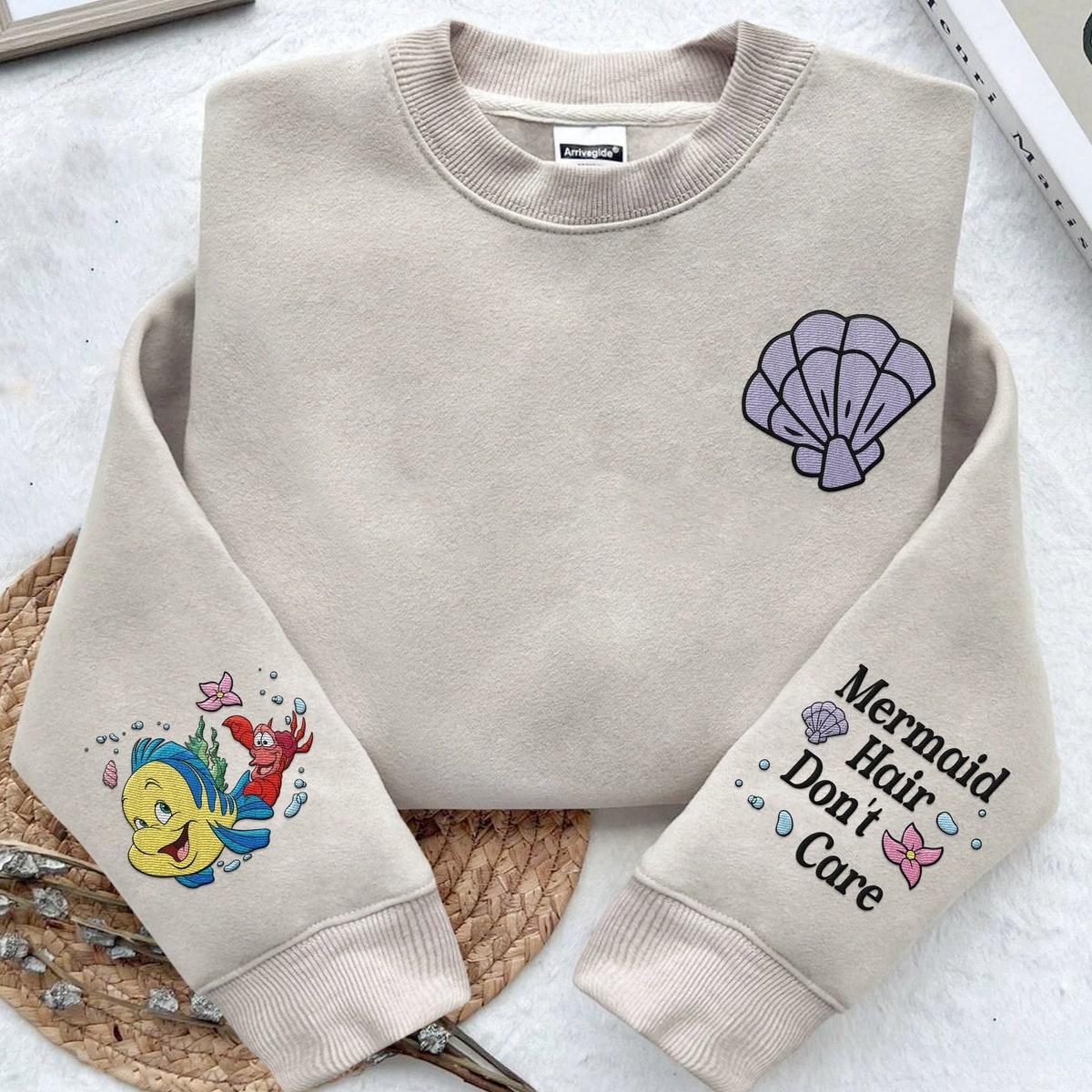 Embroidered Sleeve Ariel Flounder Sebastian Mermaid Hair Dont Care Sweatshirt 1